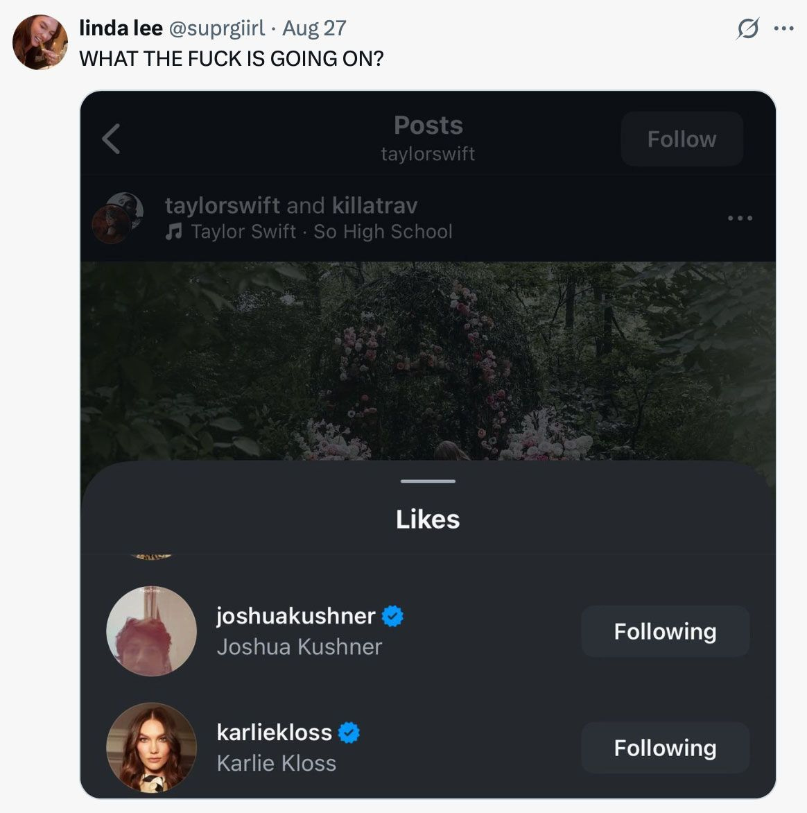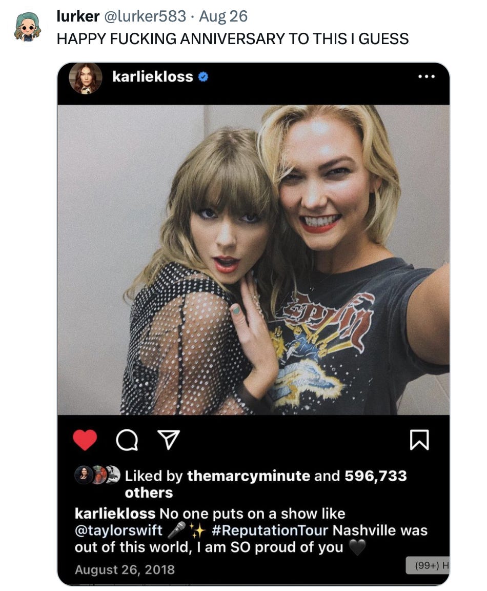 .Naturally, there was a lot of discussion about Karlie Kloss. For the uninitiated, many believe the album Reputation is about Taylor’s torrid affair with model Karlie Kloss, and the album Lover is about their breakup. Many Gaylors suddenly became private investigators, combing through the post’s likes to see that Karlie and her husband, Joshua Kushner, liked it — and that the engagement photographer had also recently shot Kloss and her children (something I’m sure Tree Paine would like to do herself).