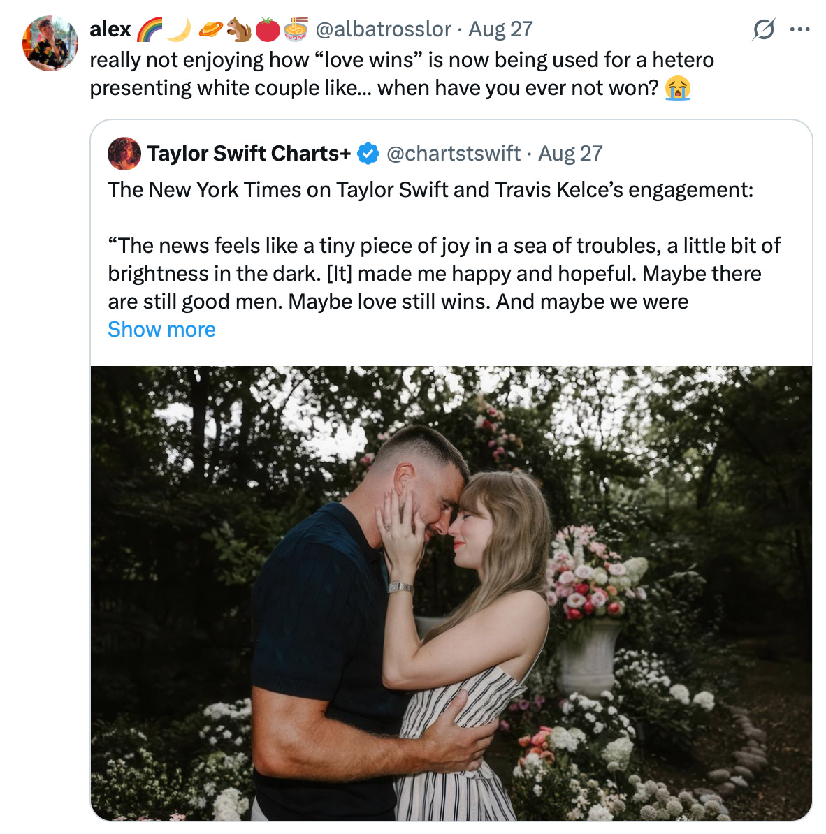 To honor what could’ve been, let me illustrate what I would’ve expected this engagement post to be, starting with the lack of Swift’s famous “fuckass filter.”