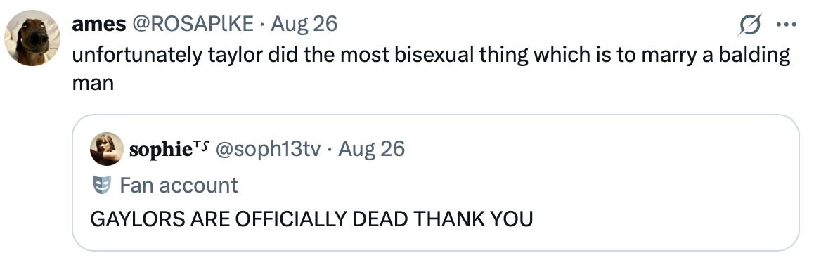 As with everything Taylor Swift has ever done, people are being completely normal about it (this is where, if this newsletter were a talk show, I would play a montage of conservatives melting down over this news — Charlie Kirk saying he hopes Taylor Swift has many children and leaves the island of the wokies, etc.). Possibly the least normal reaction to the engagement has been from the community of people who believe Taylor Swift is a lesbian: Gaylors. Earlier this week, The Cut surveyed the Gaylor sub-Reddit’s reaction to the heterosexual engagement, and the collective freakout has continued to spill over onto X. Opposite Betty Who holding space for Renée Rapp, I hold space for the Gaylors still holding out hope. As will be my duty in this corner of Dinner Party, here is a selection of my favorite reactions and theories that people chose to put on the internet